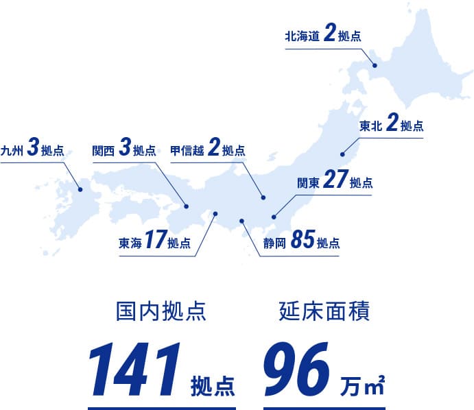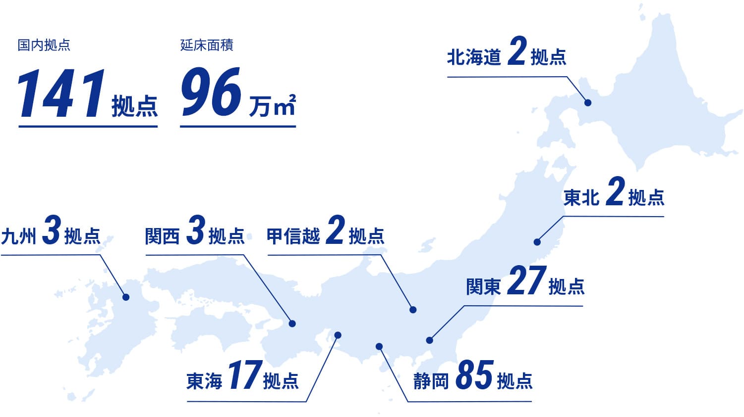 鈴与は、静岡県・清水を中心に日本国内に多数の拠点を持ち、北海道から九州まで全国各地に物流センター・ネットワークを展開しています。